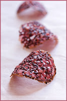 1) Appareil for tuiles aux 2 sésames Mixing 4 egg whites, butter en pommade (soft at room temperature), flour + black and white sesame seeds. Quantities are said to be TANT POUR TANT (TpT), literally meaning "that much for that much" : first weigh the 4 egg whites. Add the same weight of butter and the seeds. Incorporate the same amount of flour. Don't overwork (otherwise the dough will shrink) but make sure you have no lump. On a silpad or a parchment-lined sheet pan, form the tuiles using an offset spatula or a spoon (you can use a template to form a nice shape). It might help if you rince the spatula or spoon in hot water between every tuile. Make also sure that the tuiles are not too close from each other. Bake at 275ºF/135ºC until golden.